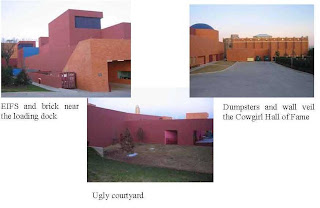 Most of the visitors will be arriving to the cultural center via University or Montgomery Street after taking Interstate 30 from Dallas or from the outer edges of Fort Worth. This museum’s loading dock hides all but the top part of the Cowgirl Hall of Fame. The back side of the new museum that is finished with EIFS is what one will see when approaching the cultural center on Montgomery Street.